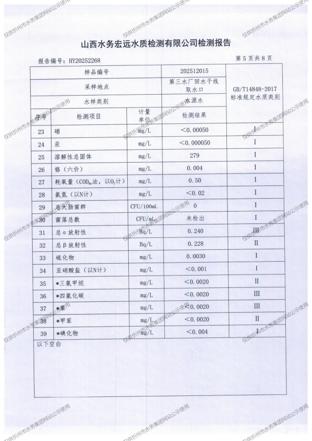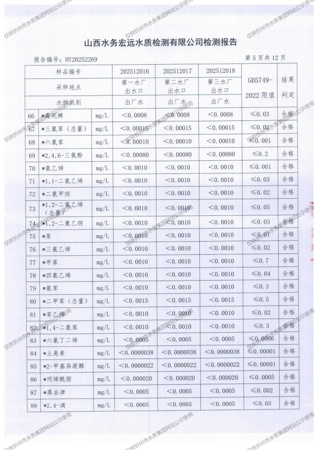 忻州城區(qū)公共供水水源水、出廠水、管網(wǎng)水、管網(wǎng)末梢水2025年12月份水質(zhì)信息公示